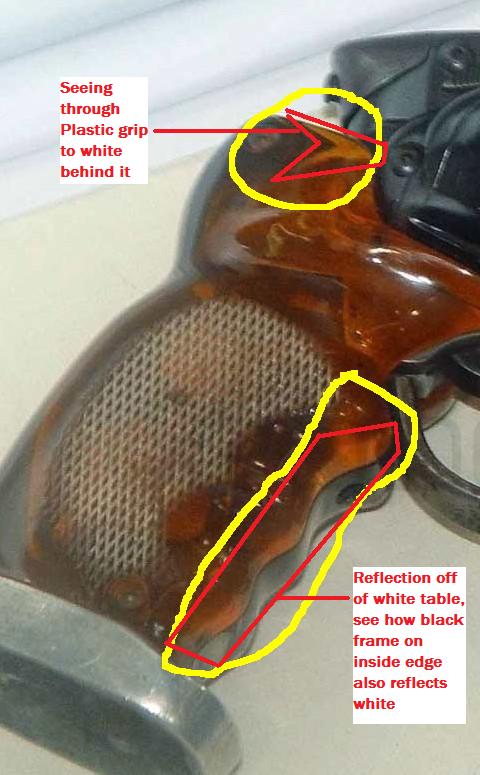 Same side of grip -- note little triangle of black near upper right corner under amber grip and the res t of area circled appears to be metal colored in comparison to the little swatch of black. I don't think amber grip shape or glare is distorting image here because if it was, it should be distorting the image equally, yet we can clearly see the black patch at top and the rest of area appears to be metal.