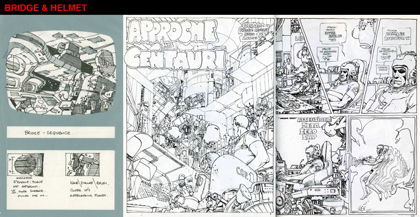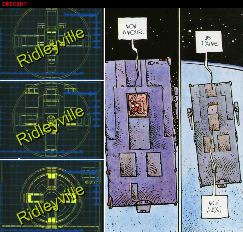 Some details of this Ridleygram (on the left) look very similar to what we can see here and there in these Moebius' late 70's pages (on the right), taken from the Approche sur Centauri short story... (chair and pilot, helmet)