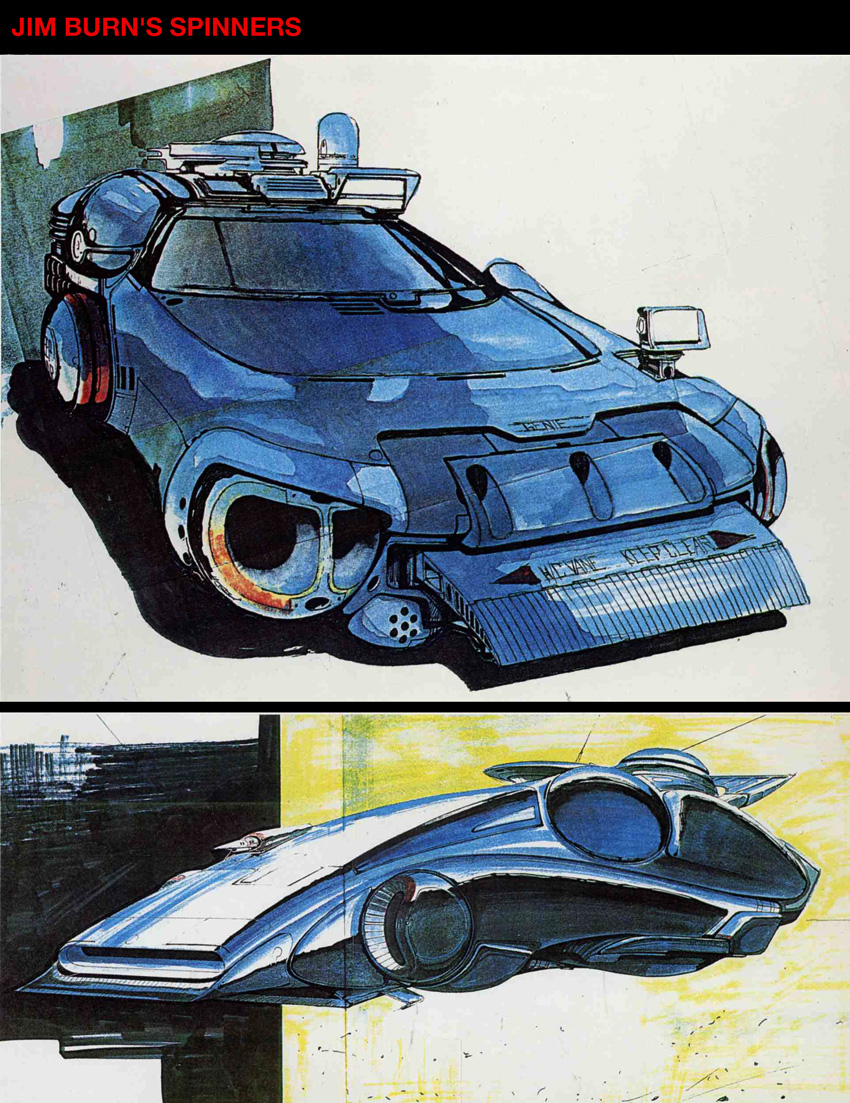 Although never credited (at least to my knowledge) for his contribution to the film, some of his Spinner concept sketches can be seen in the Blade Runner Sketchbook, pages 6, 7, 8, 9, 10, 11 and 12.