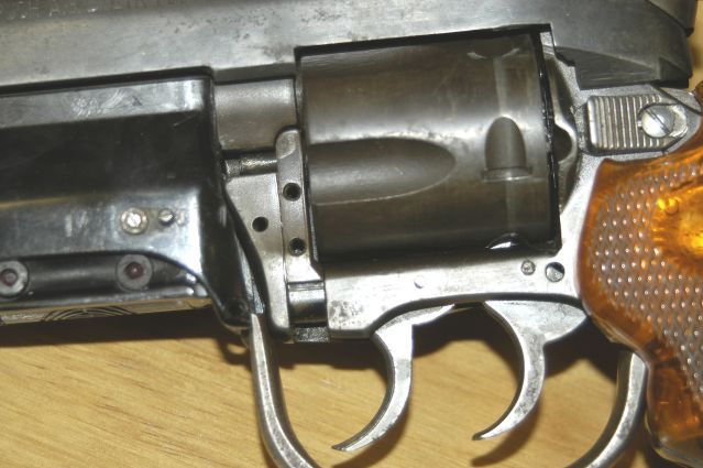While the pics of the hero show clearly what had been done (at the time) with the weapon, there's still the unknown surrounding the type of loading and blanks they used. Even the slotted screw has been changed (maybe lost during or after the movie) Confused