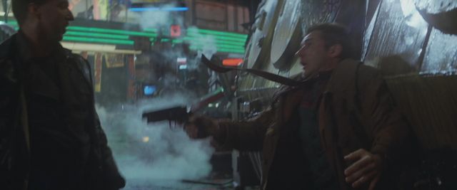 Second: the scene where Leon attacks Deckard, who pulls out his blaster, but Leon simply smash it out from his hand,
