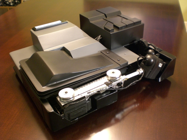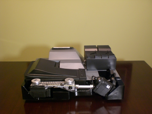 This is a display prop only (the arm at the back can be raised up and down and the eye piece can be adjusted to be stowed into the trench at the rear left-hand side of the machine).