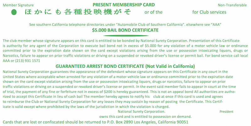 National Surety Corporation guarantees the appearance of the defendant whose signature appears on this Certificate in any court in the United States where acceptable, when arrested for any violation of a motor vehicle law or ordinance committed prior to the expiration date shown on the card, except violation arising from the use or possession intoxicating liquors, drugs or narcotics, failure to appear on prior traffic violations or driving on a suspended or revoked driver’s license or permit. In the event said member fails to appear in court at the time of trial, the payment of any fine or forfeiture not in excess of $200 is hereby guaranteed. This is not an appeal bond. All authorities are authorized to accept this Certificate in lieu of cash bail The member hereby agrees to notify his car club at once if this card is used, and agrees to reimburse the Club or National Surety Corporation for any losses they may sustain by by reason of posting this (or the) Certificate for bond. This Certificate is valid except where prohibited by the laws of the jurisdiction in which the violation is charged. |