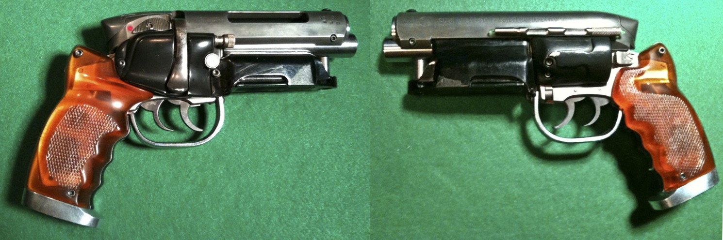 In my research, I've found that the Blade Runner gun went through many modifications during its life. Things were redrilled, holes were covered up, parts were switched out, things were unfinished. It's entirely possible given the complexity of this piece and the inherent problems creating a "firing" replica (blank or live fire) that when this piece was first used, the sideplates were damaged or launched off the piece. This would explain the apparent discrepancy from the first photo above and the final, screen-used piece photographed at World-Con and sold at auction in April of 2009.