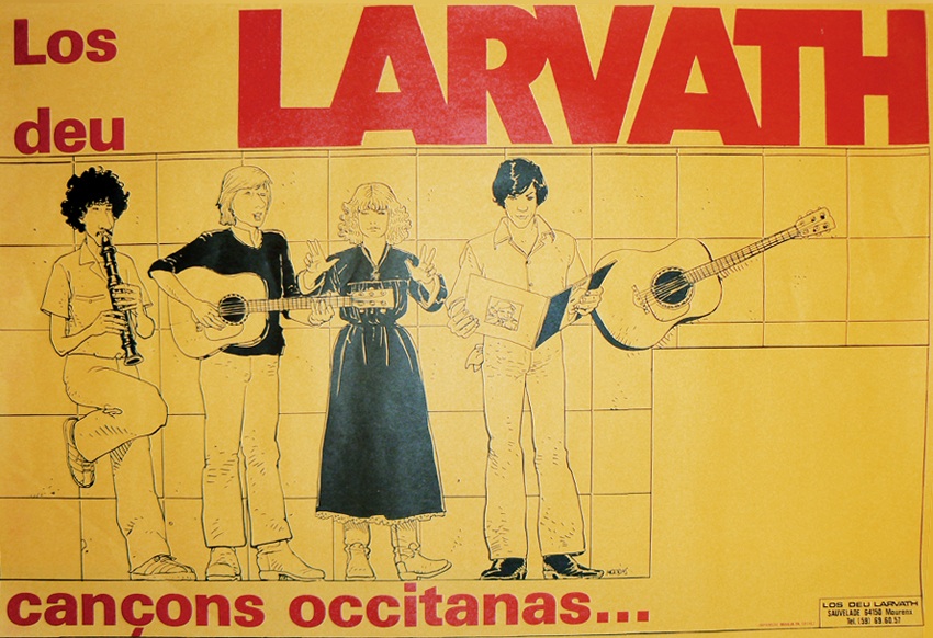 I already shared that poster Moebius drew for a Jazz festival, but he also did a drawing for a folk band named Los deu Larvath that was finally used as a poster. The name "Los deu Larvath" is Occitan for "Those from the Valley of Laà", a place between the towns of Pau and Orthez...