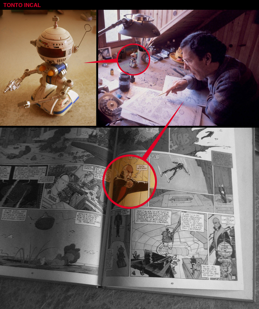 When I was looking for photos of his home in Castet, I stumbled on a photo of him at work on L'INCAL... The photo was taken in Castet, yes, but a toy displayed on his drawing table immediately caught my attention : A little robot named "Tonto" that was one of the main characters of the SAN KU KAI tv show. this japanese show was very popular among french kids in the early 80's, it had a "Star Wars meets Captain Harlock vibe" that most of them loved. My brother had the very same toy, I still have it... It's one of the very few toys that survived our childhood, and it's in not so bad shape, considering its age ! (photo on the left)
