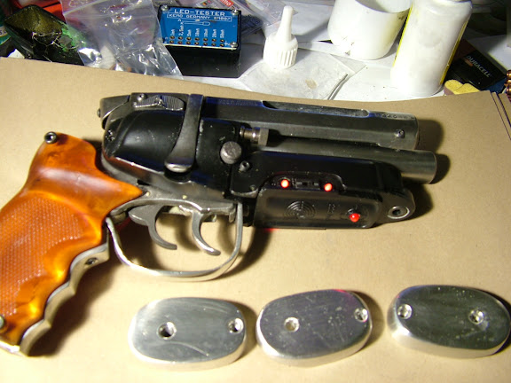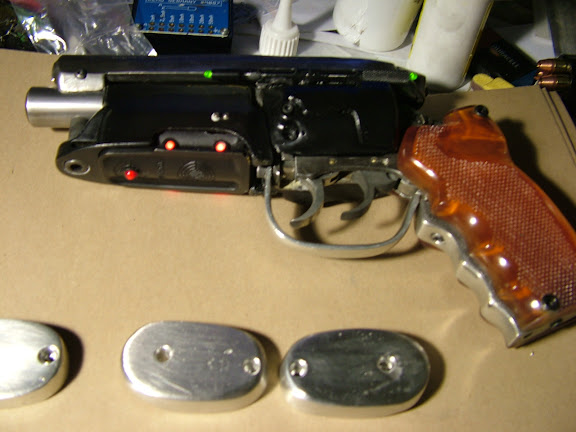 Ok , here are some shots of the virtually completed blaster , now at a stage ready for weathering , I had a couple of slag damaged butt plates that Rich kindly replaced, but I decided to give them a go and tried to turn the 'damage into the feature but plate we all know and love , there shown with a first pass polish , but no weathering yes I've statred slight weathering on the gun , but more is intended. All electronics fitted and working