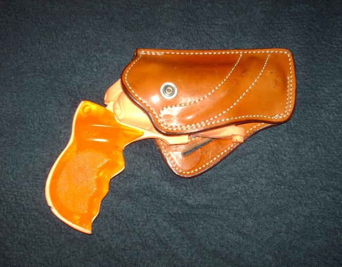 If I do finish it and use the gun, I will have to forgo the Laser rod, because it fits pretty tight. Even more than on the larger holsters. It would get easily ripped off. I wonder how one of the Hartford Snubs would fit in it? Not that I can afford one mind you. It makes a nice display none the less.