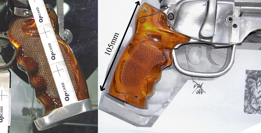 My measurements also had not completely calculated the foreshortening in Karl's picture, so there was a bit of guesstimation. I used the first few pictures from the "out of the case" set. We could also use other known dimensions in existing gun parts like the real bulldog grip to compare.