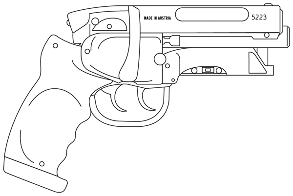 I may be able to sketch one out in a few days. The Bulldog interior grip is blackened aluminum. You can see just a bit of edge wear in the Worldcon photos. A flat black primer would replicate the look well. The outside grip frame seems to be aluminum or stainless painted gloss black as are the cylinder covers. The Steyer Reciever was Blued a dark gun metal that was scrubbed off, giving it a multi tonal quality especially with the rust. The Steyr Clip and housing are black plastic, that is glossy. The trigger guard is bare steel with a bit of rust. The barrel I think is gunblued about as much as the Bull dog itself is, also with a bit of rust. The butt plate is aluminum or stainless that the very bottom was painted flat black, probably to reduce glair from the lights on the flat surface. The triggers seem slightly blued as well, but still not as much as the Steyr reciever was. They may be just showing a natural patina, but I think they were once blued but normal extended wear took off the bluing more naturally.