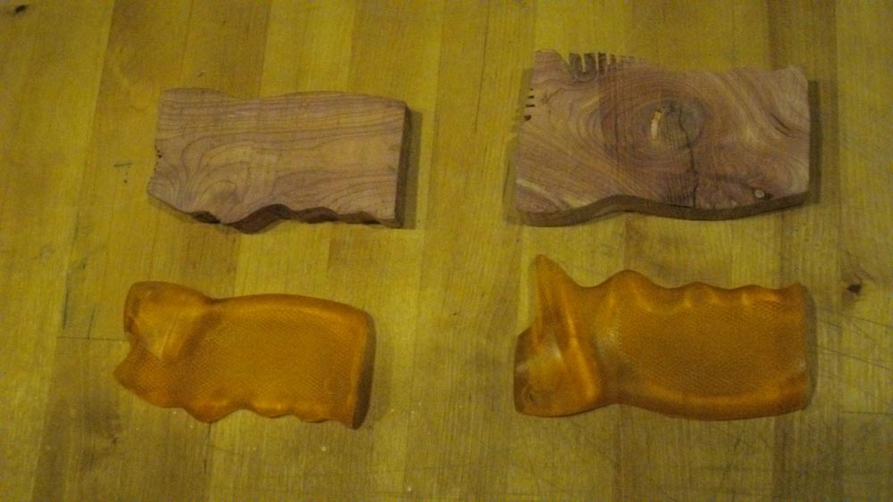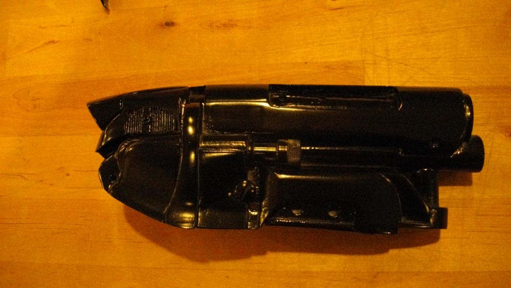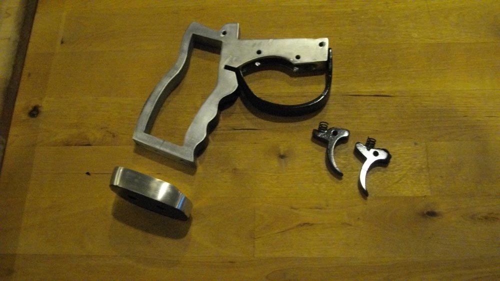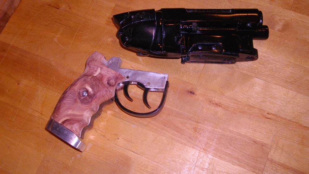 I decided to have a go at it. The grips are actually pretty good, so I'm saving them for a future project. I wanted to try wood grips again anyway. I replaced the grip frame, butt plate and trigger guard with aluminum. I spring loaded the triggers. I replaced the resin nub in the top barrel and replaced it with a metal nozzle from a spray gun. I then replaced every screw and bolt with metal as well as the over-sized binding post.
