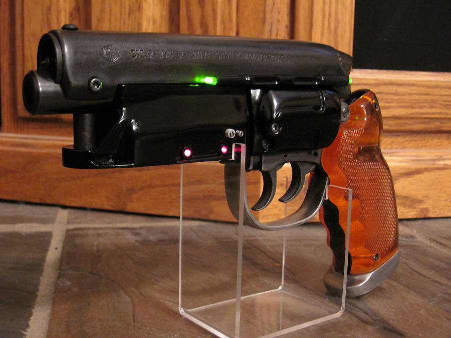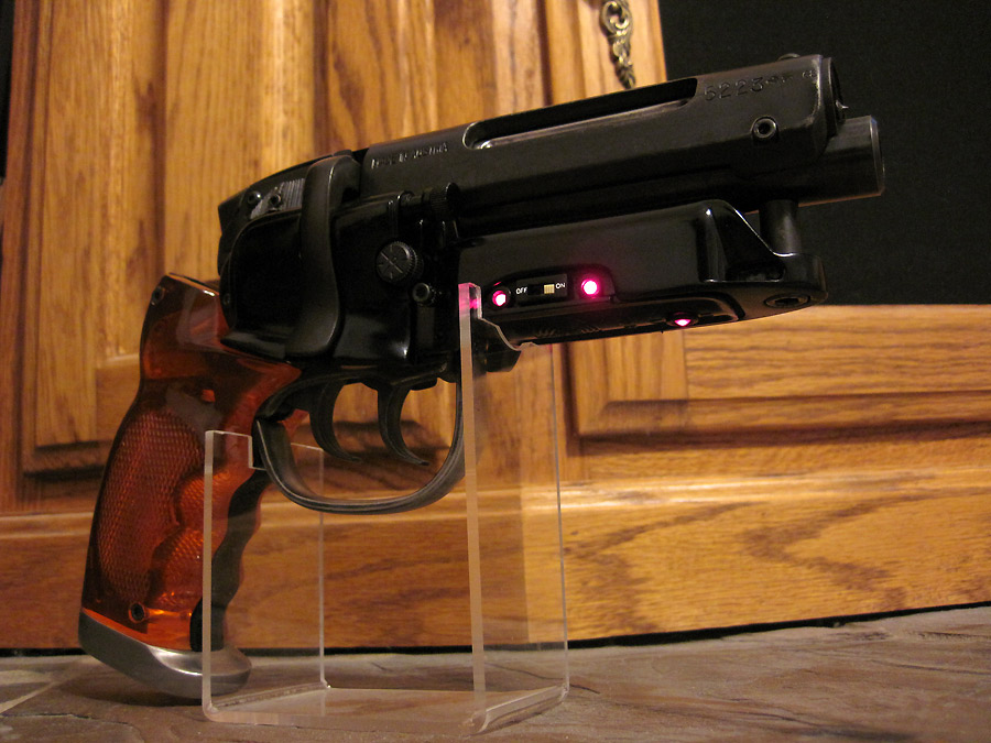 Got my Sidkit around this time in 2008 and was so paralyzed by getting it just right that I stopped working on it. My Tomen gave me a little more confidence so here is the final result. The bluing was an absolute mess like I thought it would be. The metal would form a rusty brown patina as I applied it. It took several applictions and a rubdown with some Break Free CLP. I filled the extra holes in the bulldog frame and replaced the stock barrel with mspaw's steel one. Since the green led's came pre-wired I couldn't bring myself to NOT wire them up. I also replaced the plastic bullets with real ones from my old Coyle blaster. Andy's superb stand completes the picture.