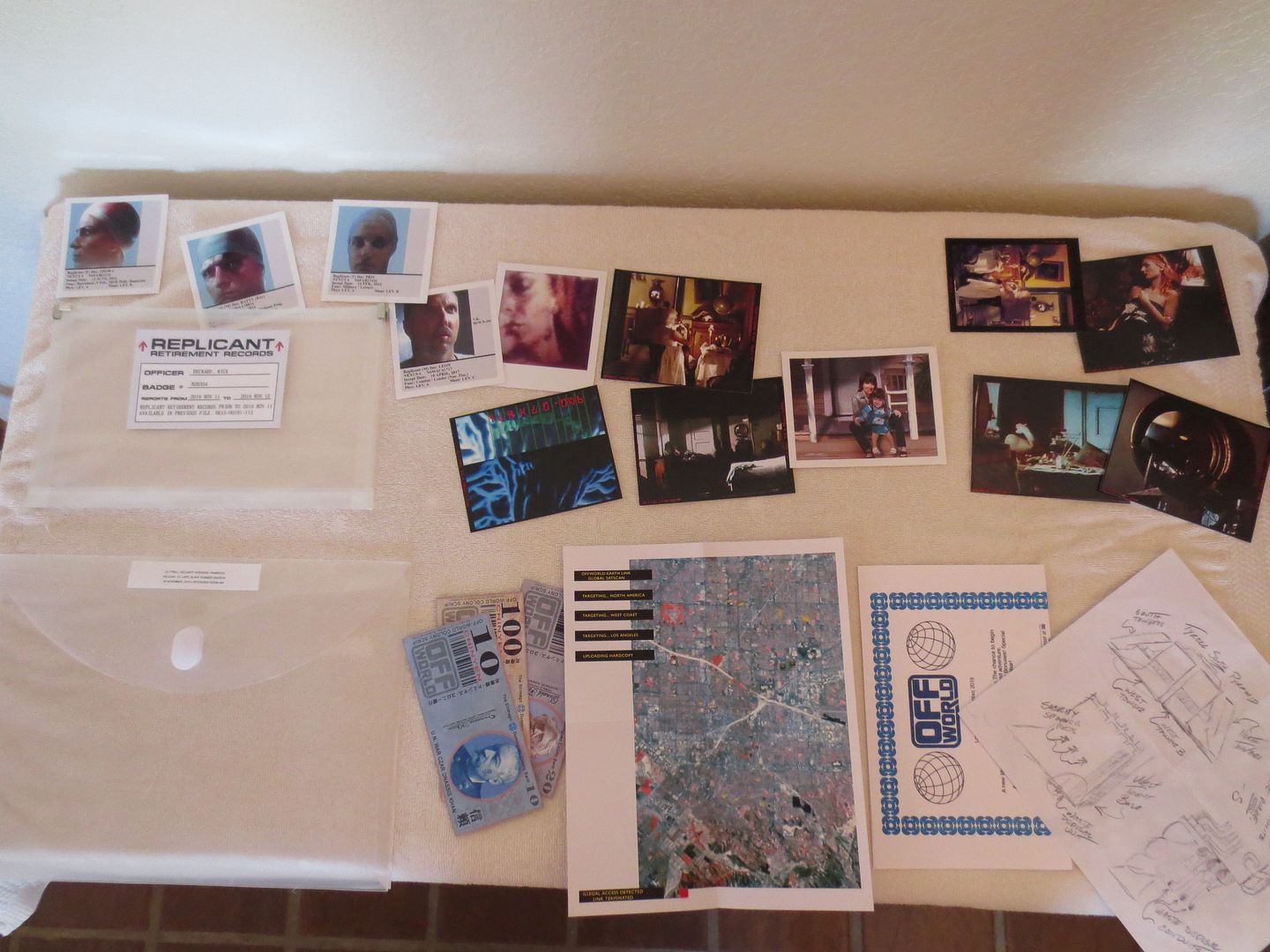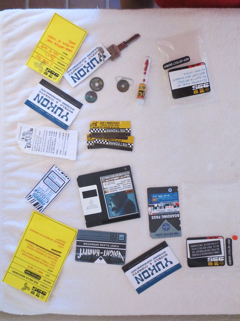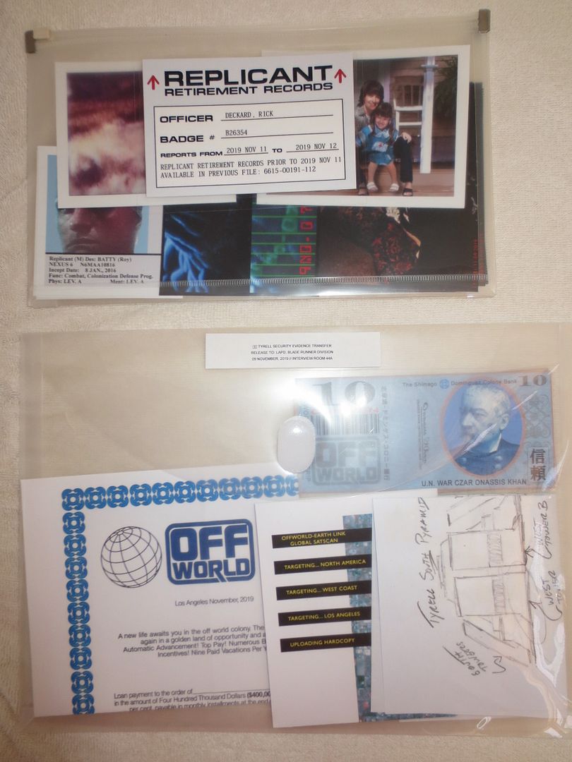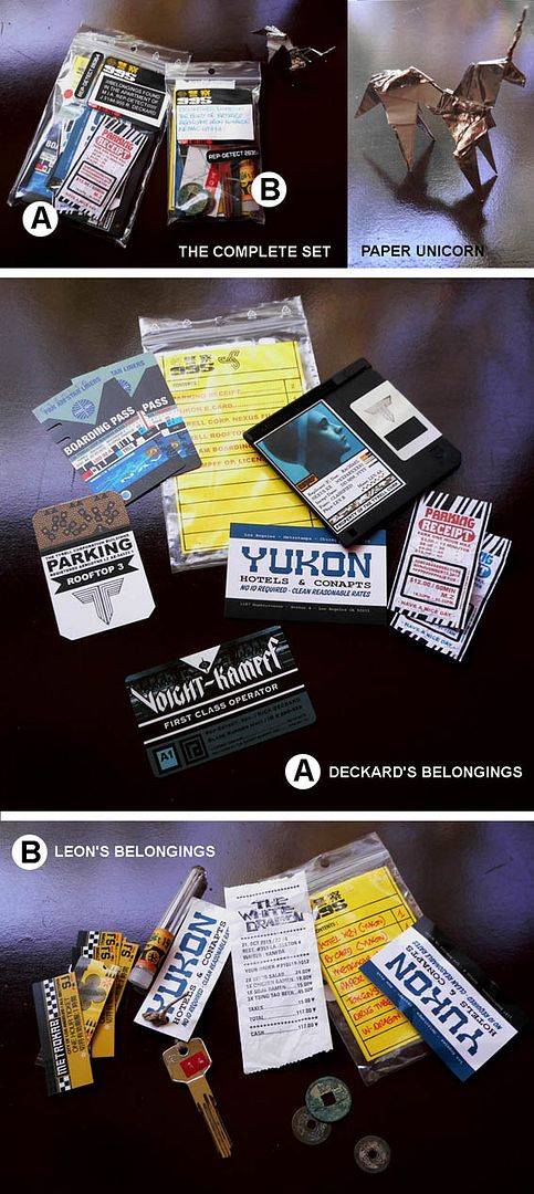 Although none of the paper props composing this set ever appeared in the movie (excepted the unicorn), I've tried to make them as "real" and screen-used as possible. Some are pristine, like Rachael's file while others are pretty weathered like Leon's Yukon Key or Deckard's Parking meter tickets...