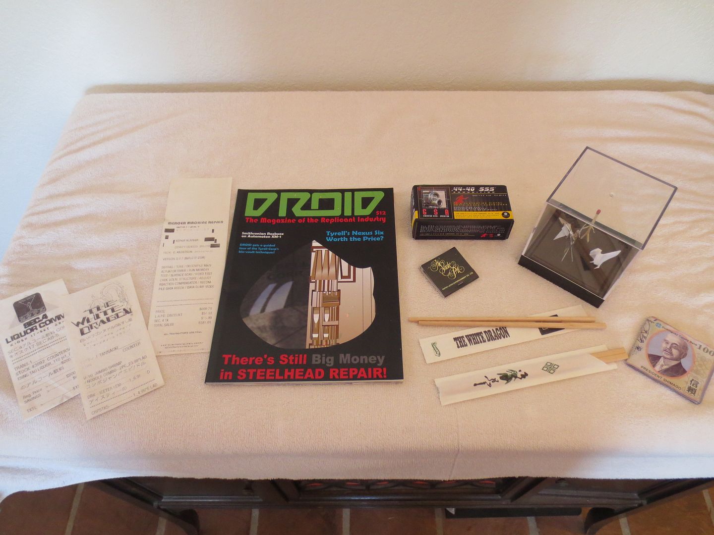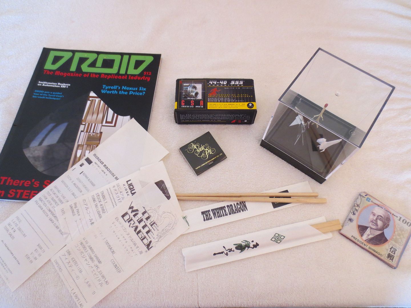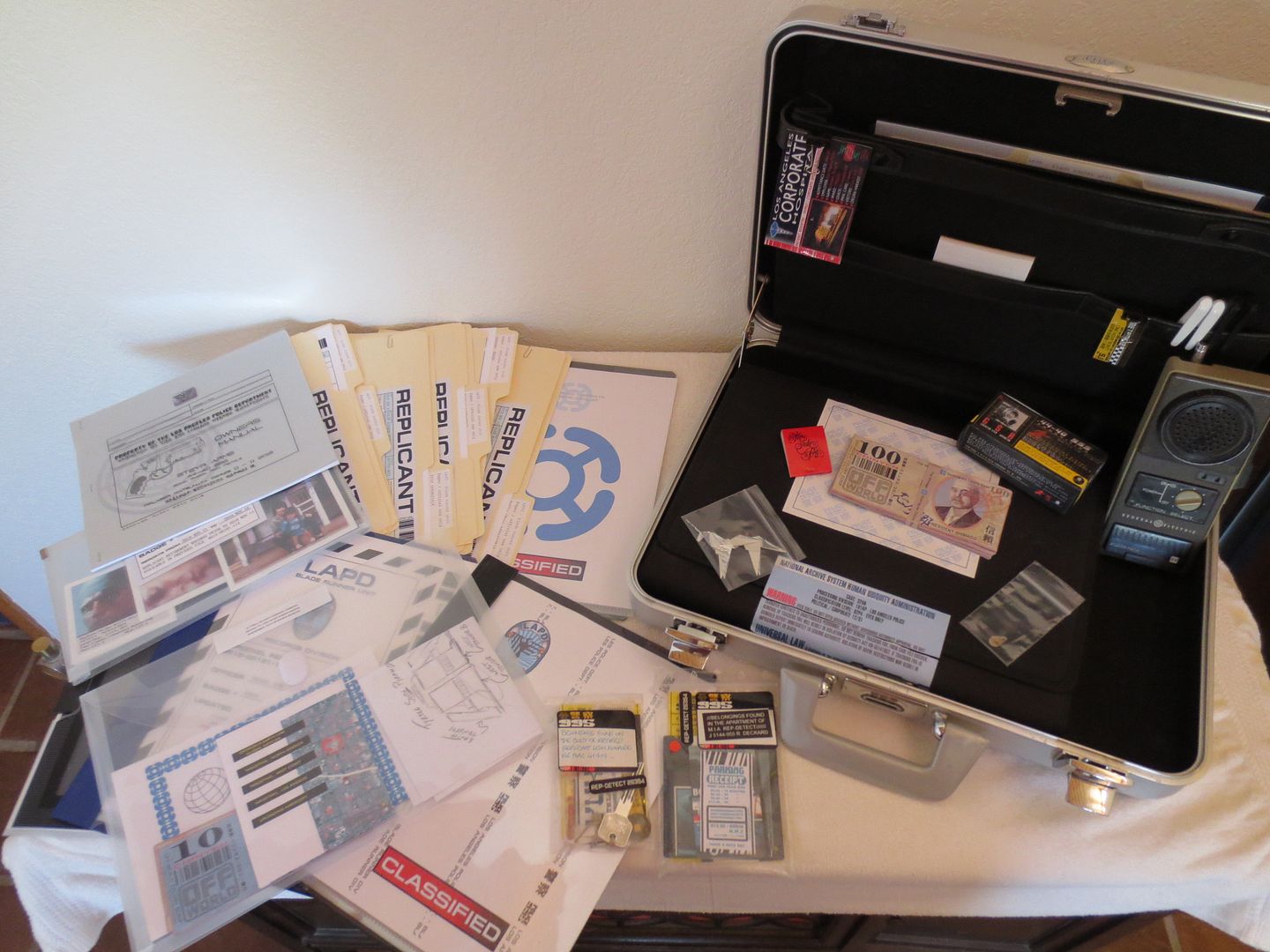 Although none of the paper props composing this set ever appeared in the movie (excepted the unicorn), I've tried to make them as "real" and screen-used as possible. Some are pristine, like Rachael's file while others are pretty weathered like Leon's Yukon Key or Deckard's Parking meter tickets...