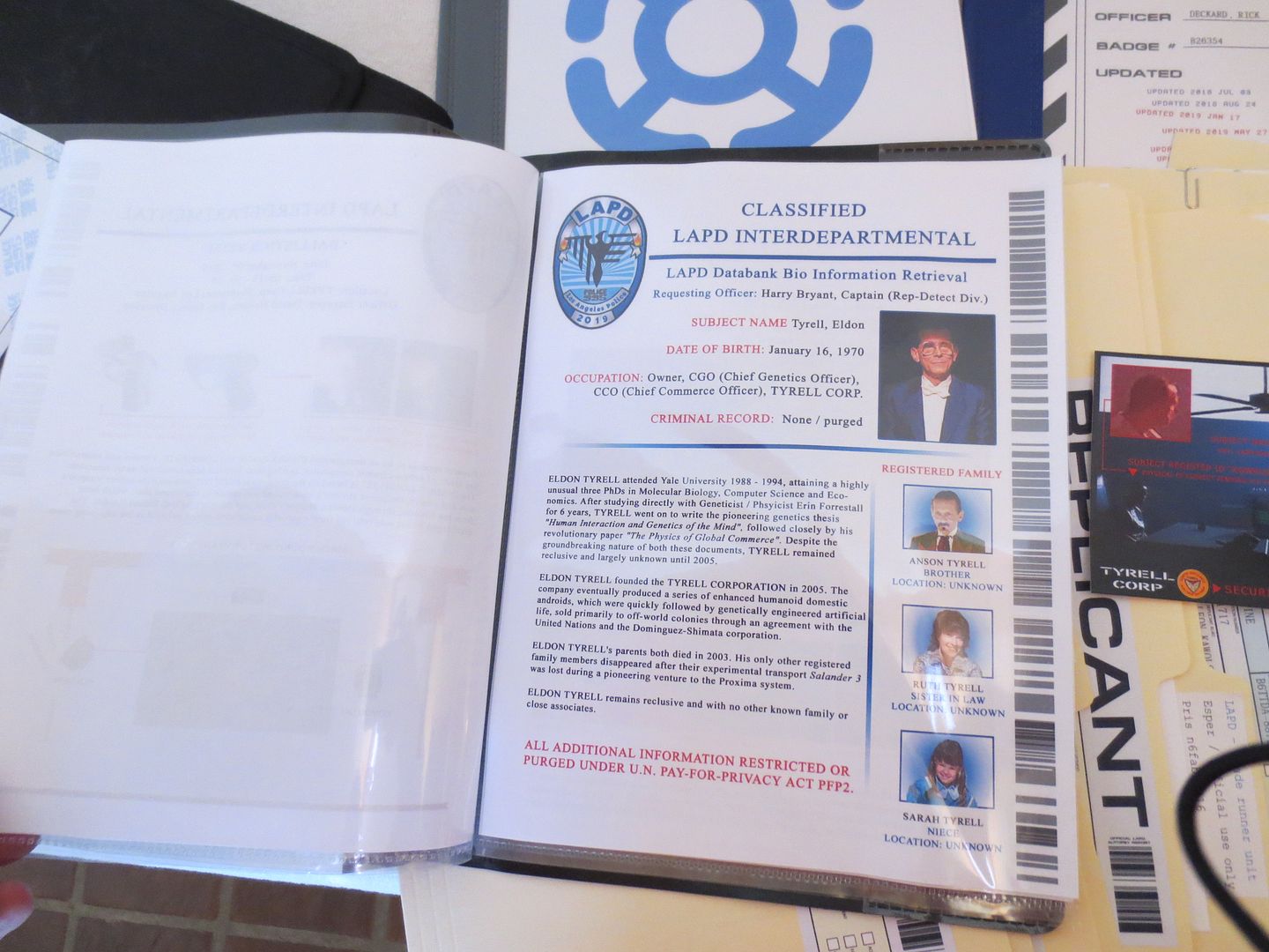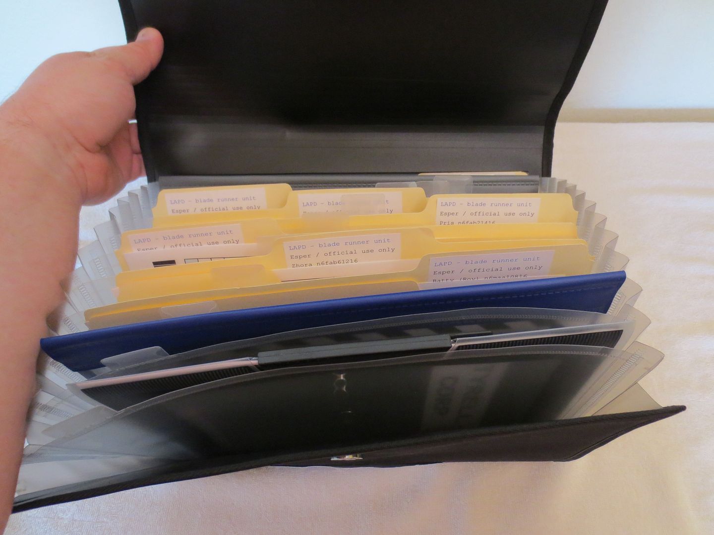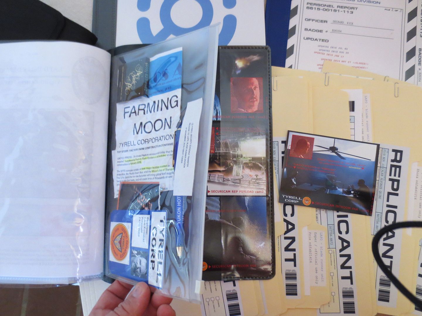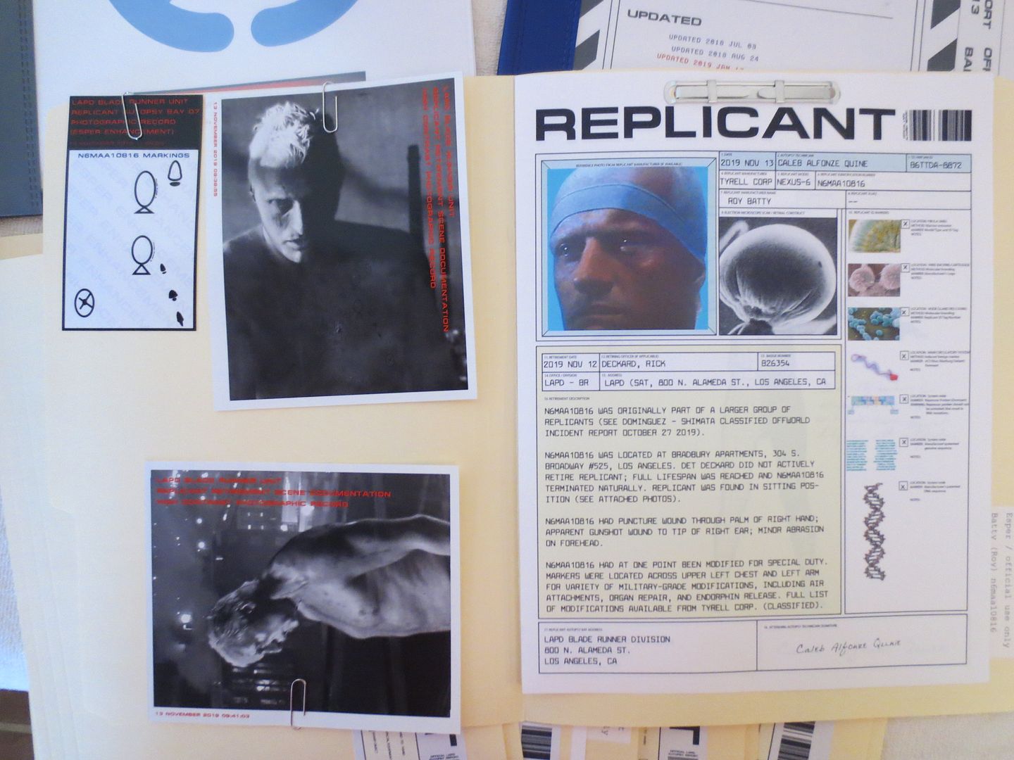 I also printed a set of the replicants files on transparencies and put them all in a three ring binder. This was inspired by the cut scene in the film. This does not go in the black file pouch and is just an extra set of the replicant's files