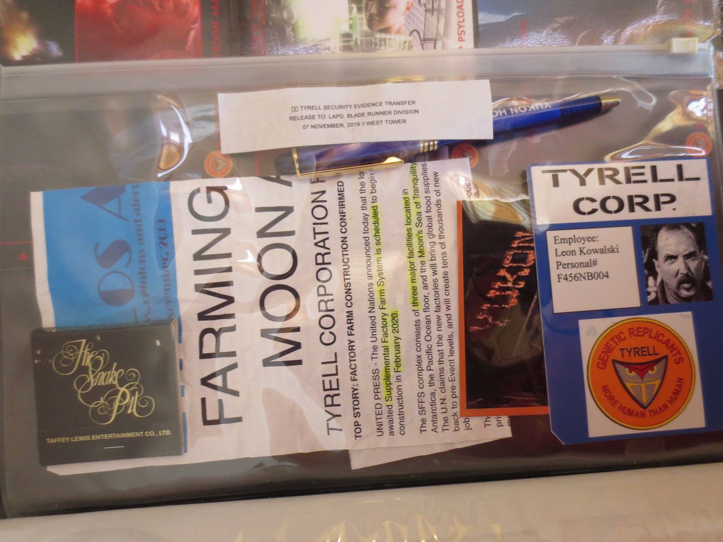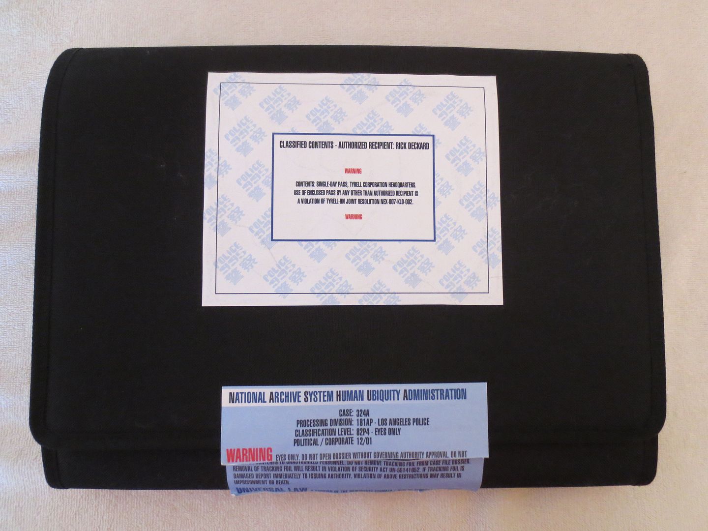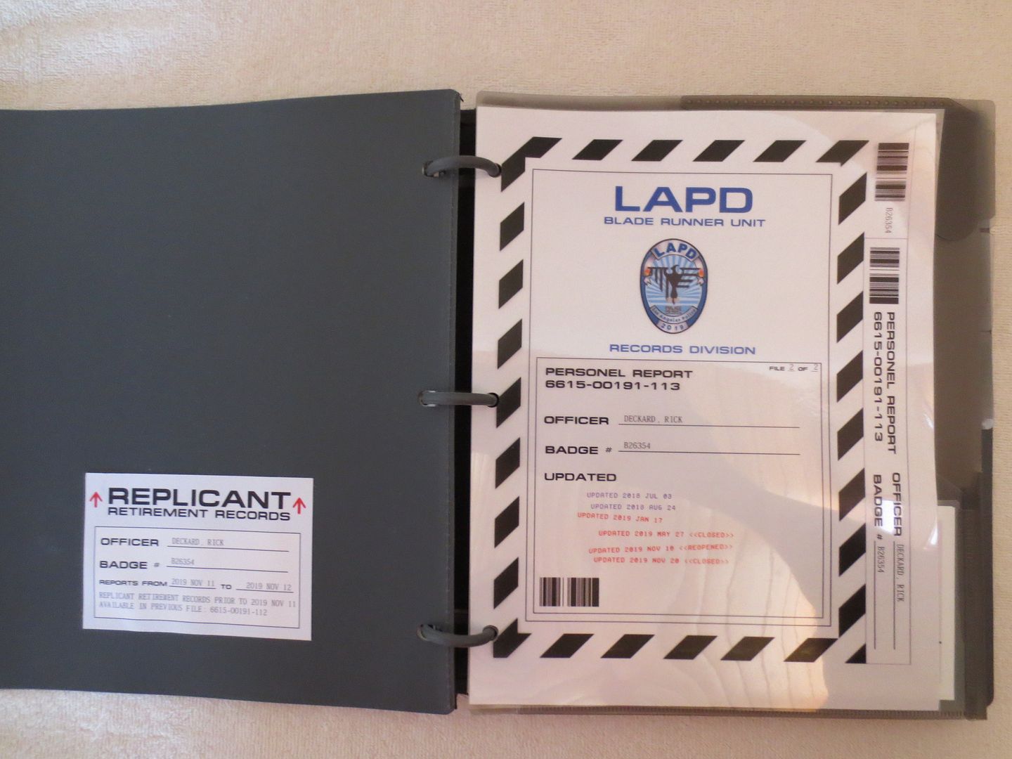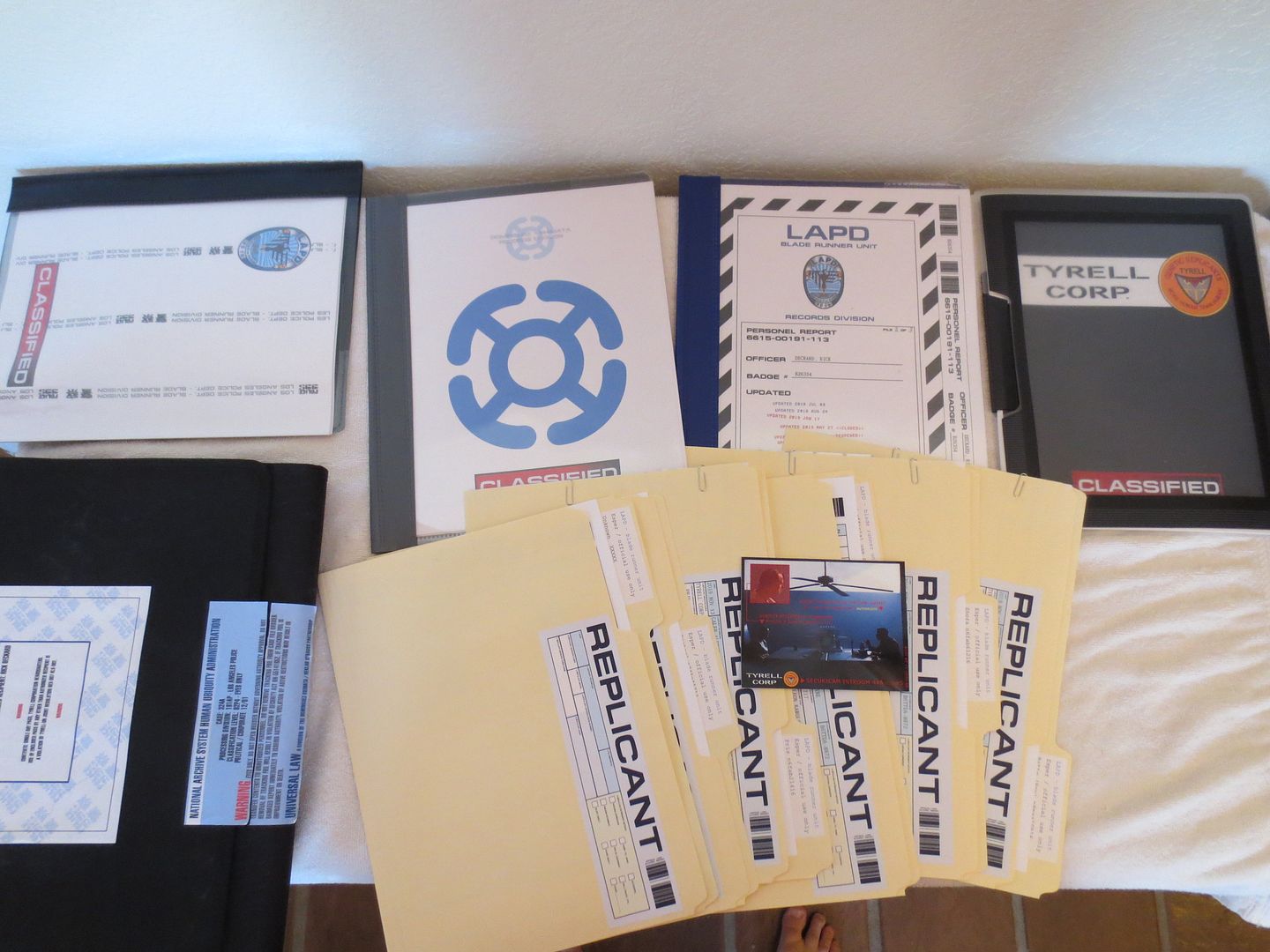 I also printed a set of the replicants files on transparencies and put them all in a three ring binder. This was inspired by the cut scene in the film. This does not go in the black file pouch and is just an extra set of the replicant's files