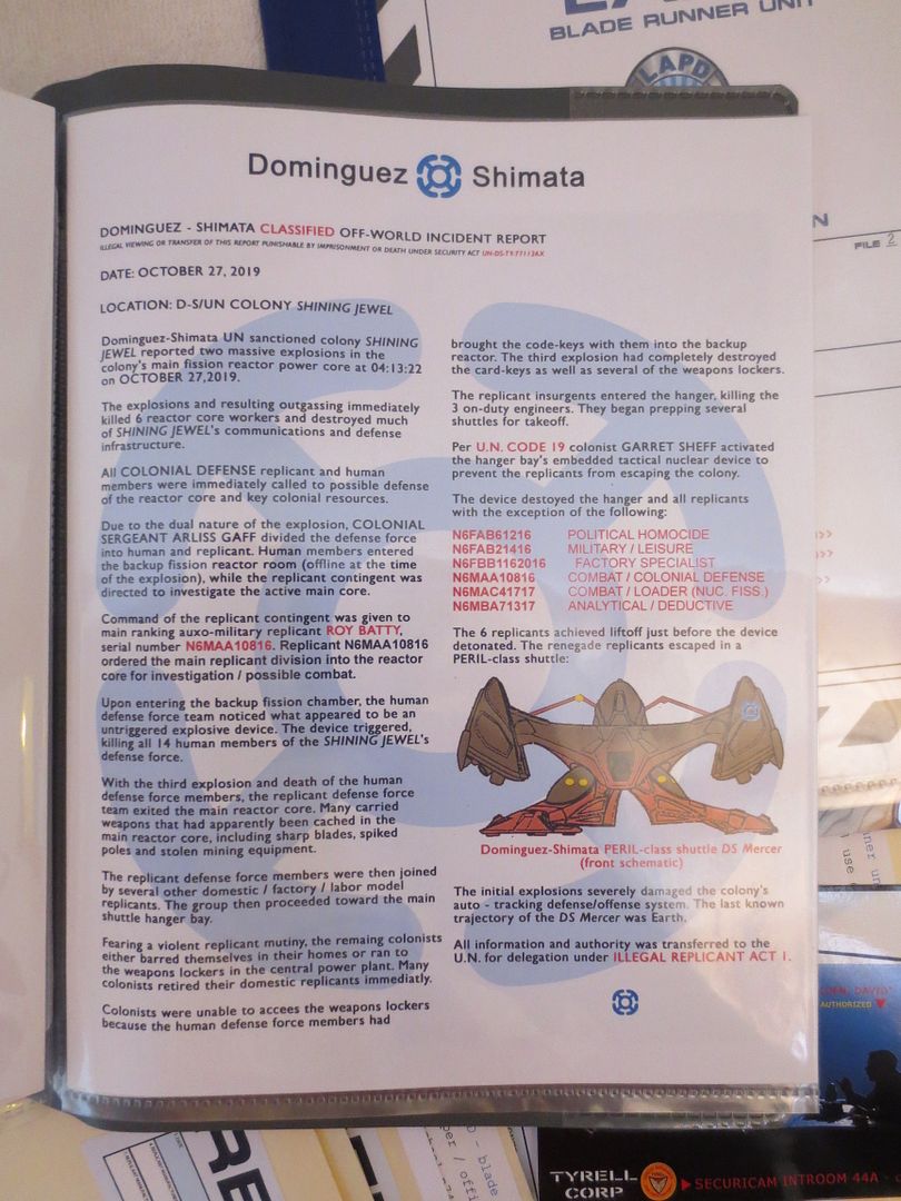 It contains a file on each replicants along with the "unkown" replicant plus an extra blank file. Each of these contain a two page report as well as pictures