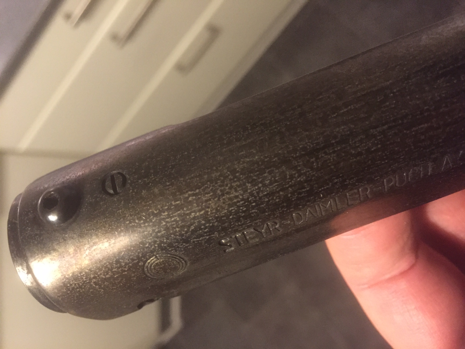 Well I would resand it and then skip bluing and use a little pewter black and go for a accurate look of raw steel.