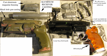What I've got here is a stunt gun prop casting I got in the early '90s, some original steyr parts, and an Offworld prop (see labels).