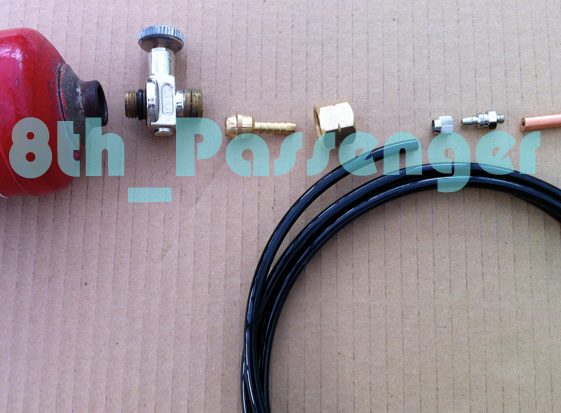 I also got a fitting that connects the plastic pipe to the copper tube (the outside feed from the propane bottle). The closest I could find was an airbrush fitting (which I bought).