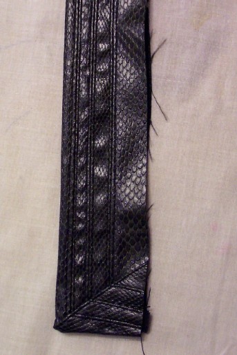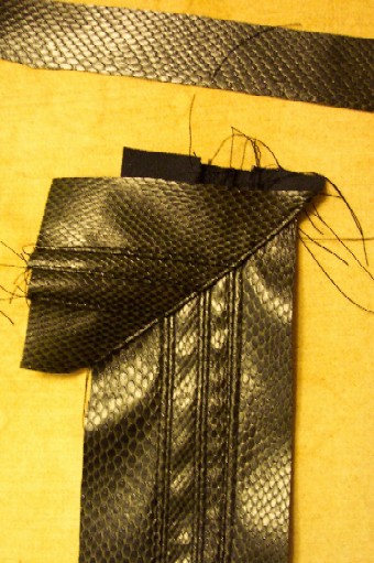 To mimic the real skin on the original, I cut 1" strips then sewed them together, topstitching on either side of the seams. I then mitered the corners by folding the shorter piece at a 45 degree angle, topstitching, and cutting away the excess.