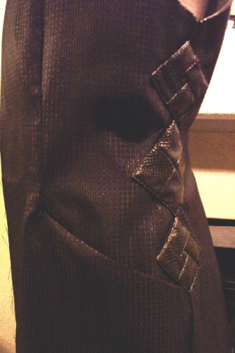 So here is the left side with the medallions applied. Not easy to get a good shot, since the fabric is shot with metallic thread and any flash makes it light up like Christmas. So these are no flash, shot at 1:00 am (yes, that's when I take a lot of pictures. sleep is over-rated.) I varied the pattern on each a bit, after looking at the original in Seattle back in April. I plan to mimic the patterns on the sleeve.