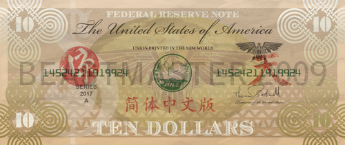 I messed with the back of the not last night. again just suttle changes, mostely covering over stuff. here I tried to encorperate symbols represented on the real dollar bill like the eagle and the illuminati all seeing eye. I also thought it might be cool to have the southwell symbol as an silver authenticity strip or something.