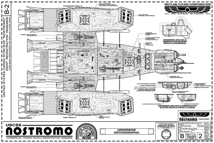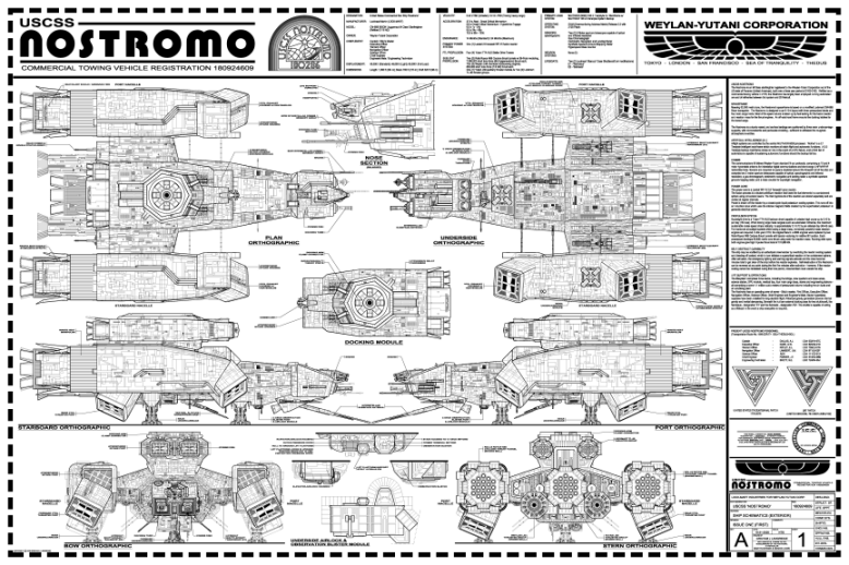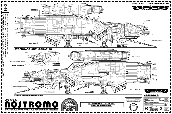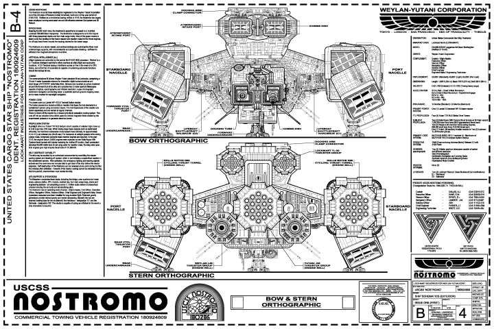 - Full Orthographic Views of the USCSS Nostromo; Bow, Stern, Starboard, Port, Underside and Plan Views.