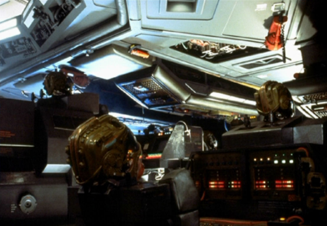 The photo was taken from the rear window seat on the starboard side, (Lambert uses this station to home in on the Alien distress signal) Ripley's flight console is in the background, Ash occupies the front window seat on the opposite port side. |