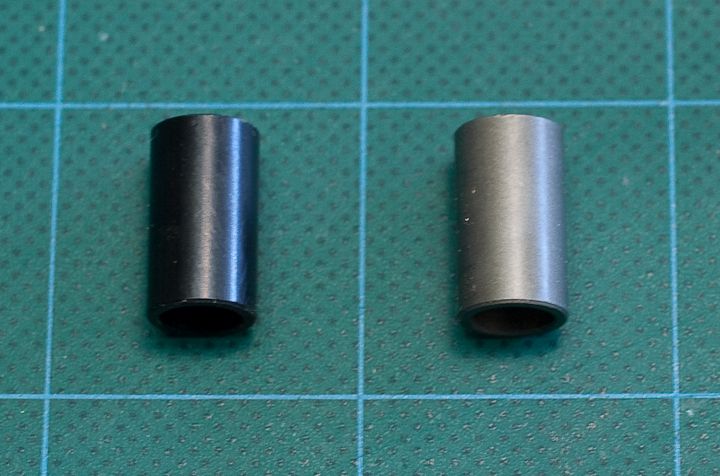 I was asked by a member if I was planning on turning steel posts to replace the black plastic one. The post provided with the kit is actually metal, and soaking it in plain white vinegar for a couple of hours took off the black finish revealing a grey steel color. It may polish up ever better but I've not tried that yet. Here's a before and after pic.