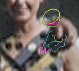 The little curved line remains the mystery. it doesn't seem to be anything in the far background. It could be the "tie" on a leather wristband, or something associated with the shirt, but exactly what it is remains a guess until someone who actually knows responds here or elsewhere with a definitive answer.