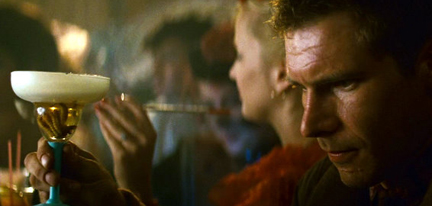 - A almost-empty wine glass? An awkward grasp as Deckard's hand still doesn't seem posed to holding it securely. And they both have drinks in hand in more regular table glasses . . .