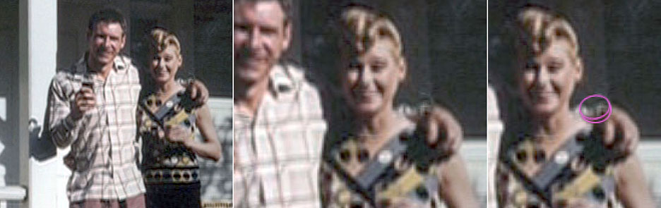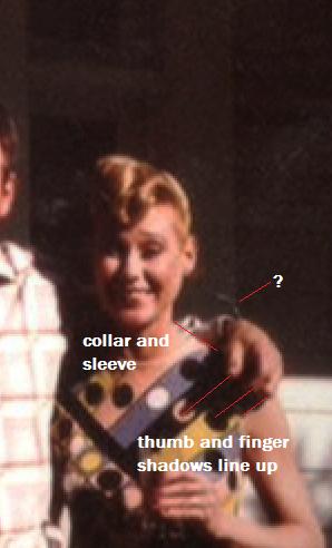 The line above his hand seems to end behind his hand. Maybe a loose watch strap sticking out of his sleeve, or even something like from the production team, including a property tag from the wardrobe dept that never got tucked in. Also the shadows line up perfectly with his fingers and thumb, with the black dot on her dress adding a little to the shape of the shadow. I don't see anything else in there, but the darkness of the shadow does let the imagination go. The other shadows on her dress also seem a bit dark though too. I may have to go back to view the BluRay set and see the original image again. I bet it shows even more because even the one I have is more than second generation, but every one of us should have the closest thing in their collections now. If only Tom has a copy of the original