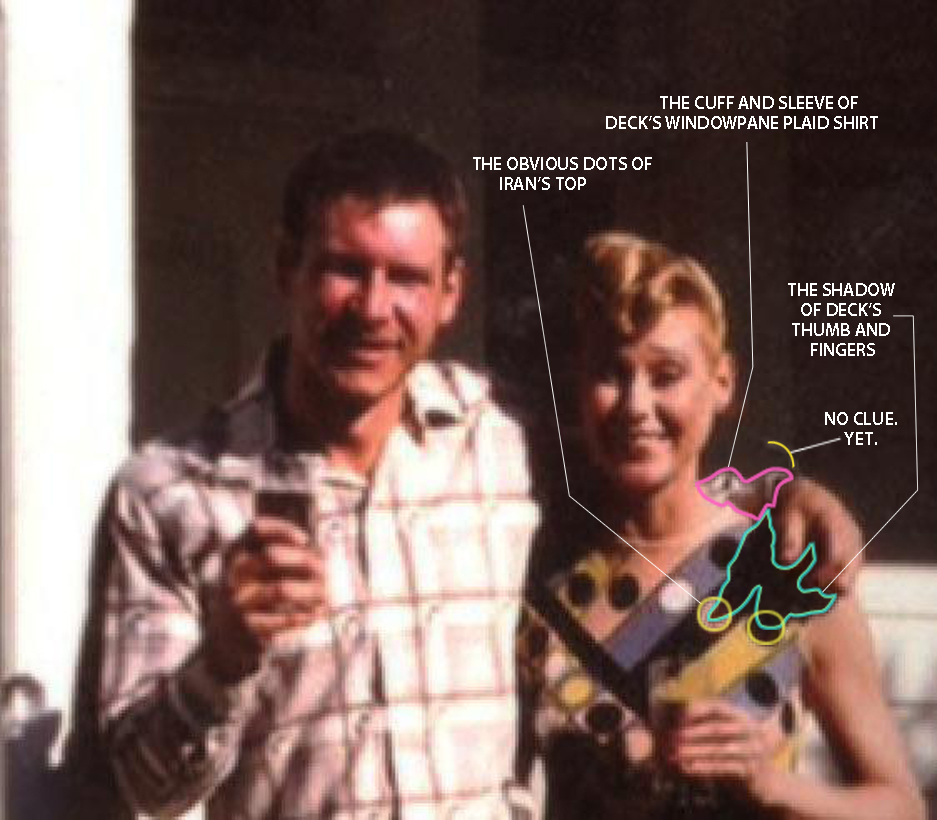The photo mystery is very intriguing. I wonder if it could be a hoop earring, or hoop from a dangling earring? The more I look at it though, it does look like Deck is double fisting it.
